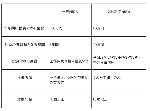 いずれも対象の投資商品の運用から得られる利益が一定期間非課税となる制度であり、以下のように詳細が異なります。