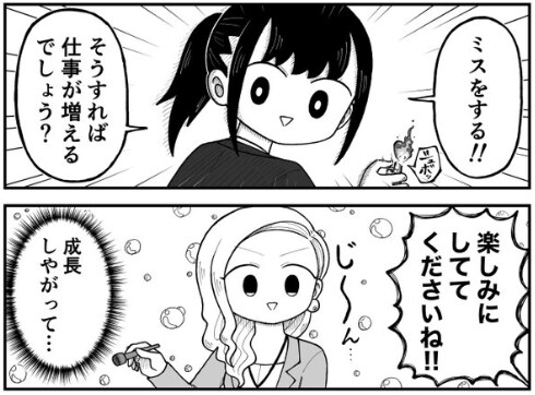 新卒ちゃんはおもむろにライターを取り出し、「ミスをすれば仕事がふえるでしょう?」と意気揚々と会社を燃やそうとします。予想の斜め上をいく展開ですが、先輩は「成長しやがって…」となぜか嬉しそう!?