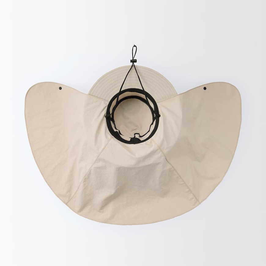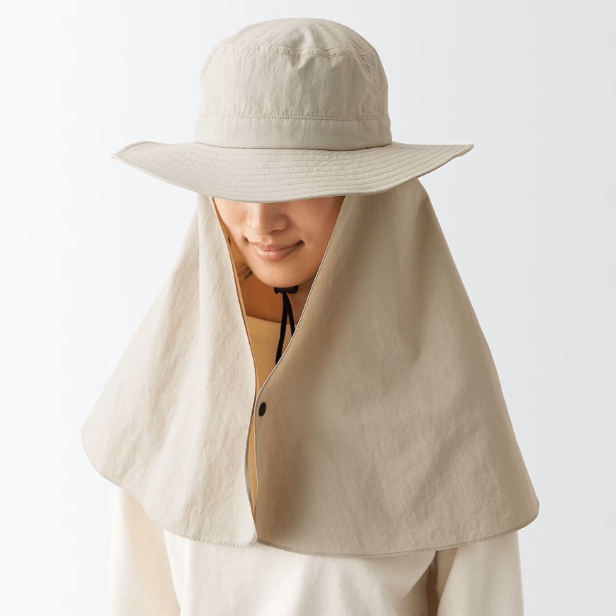特に、首の後ろ側やデコルテの日焼けを防ぎたい方の候補によいですよ。紐がついており帽子が飛ばないようにしてくれるほか、日よけ部分もアゴの下のボタンを留めれば風による広がりを防止できます。