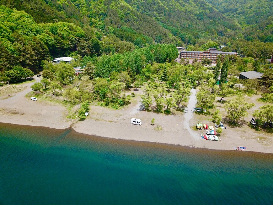 標高約1000m。夏でも涼しく、目の前に西湖が広がる抜群のロケーションです!管理棟やサニタリー設備も充実の『高規格キャンプ場』。コインシャワーや洗濯機も完備しています。