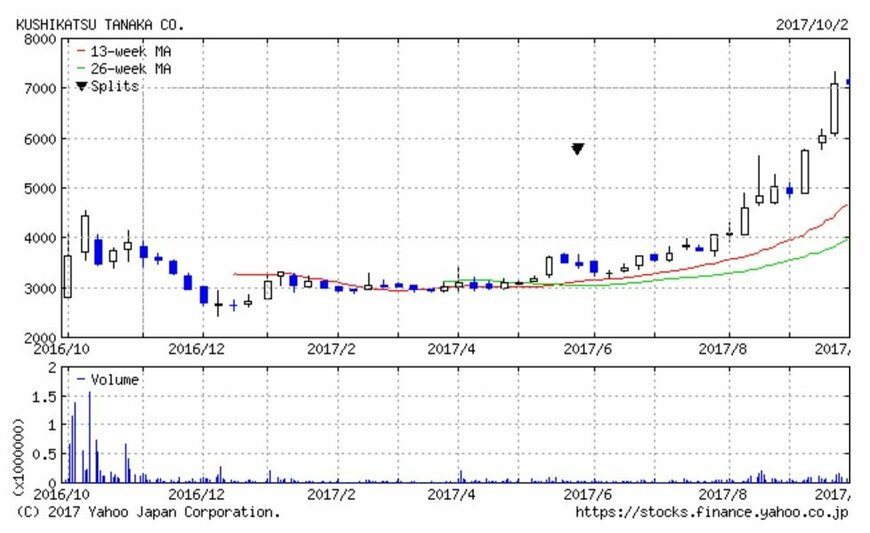 8月初旬に久々に4,000円台に乗せた株価は、8月21日に上場来高値を付けました。そして、それ以降も着実に上昇しており、9月27日から3日連続で年初来高値を更新しています。9月29日に付けた高値は7,340円、10月2日の終値は7,090円です。