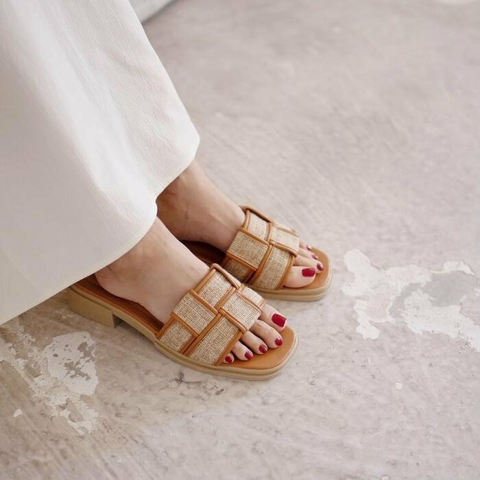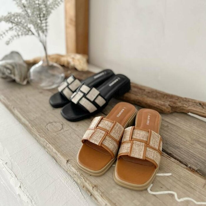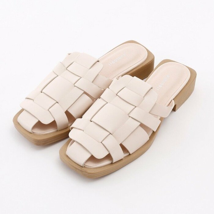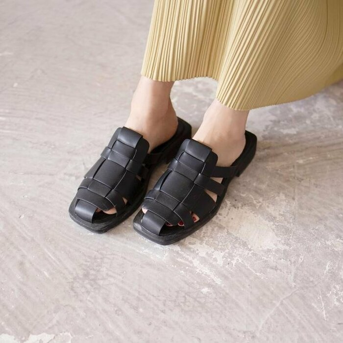 インフルエンサーの陽さんとコラボした、春夏らしい素材と柔らかい合皮の異素材コンビが大人上品な編み込みサンダルです。ゆったりとした仕様なので甲高幅広という方にもおすすめですね。