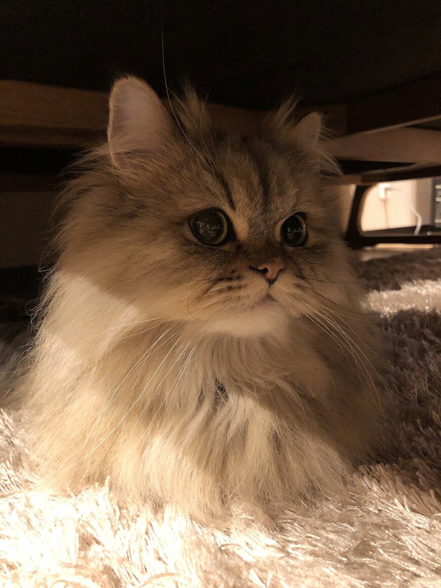 Twitter上でたくさんの注目を浴びているのは猫の「パピコ」くん。もふもふの被毛とまん丸のおめめが印象的な男の子です。そんなパピコくんは、机の下で香箱座りをしていた様子。