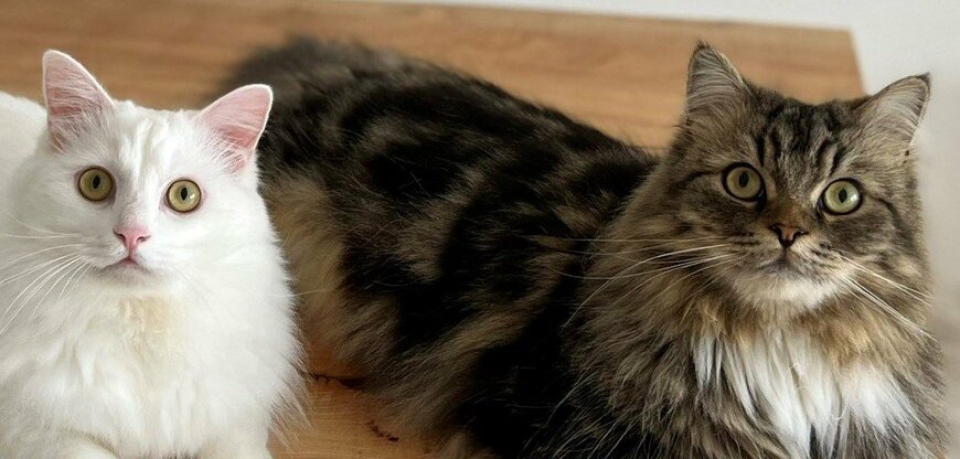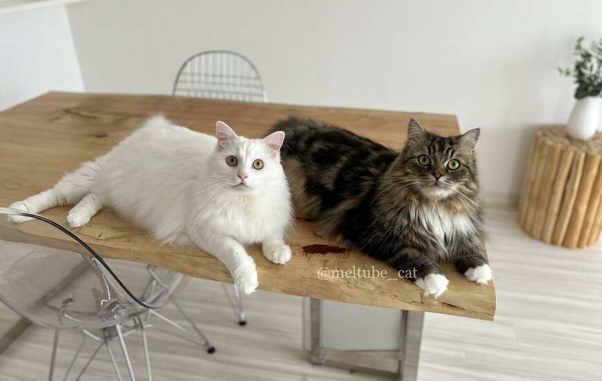 注目を浴びているのは2匹の猫ちゃんです。キジ模様と靴下柄が印象的な先住猫「メル」くんと、真っ白でフサフサしたボディが特徴の元保護猫「マオ」くん。