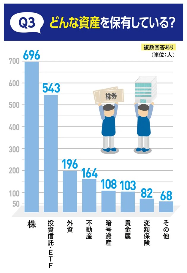 株式会社モデル百貨の調査によると、資産運用をしている人が保有する資産で最も多かったのは「株」で、次いで「投資信託・ETF」という結果になりました。