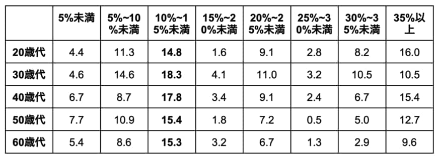 二人以上20代世帯以外の、単身・二人以上世帯の年代では、10〜15%未満の貯蓄割合がボリュームゾーンとなっています。