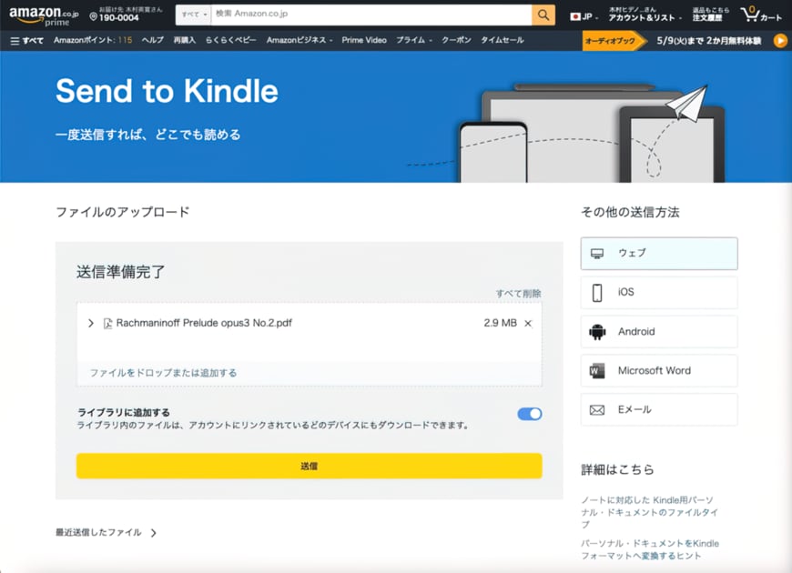 ブラウザ上に送りたいPDFをドラッグドロップして送信ボタンを押すと、すぐにKindleのライブラリに表示されます。