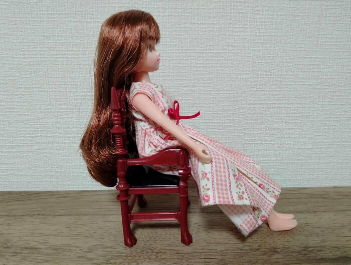 横幅がある玉座なので、リカちゃん人形を座らせることもできます。ただし、玉座の高さが低いので、脚をうまく折り曲げて座らせることができません。写真のようにお尻が浮いてしまいます。