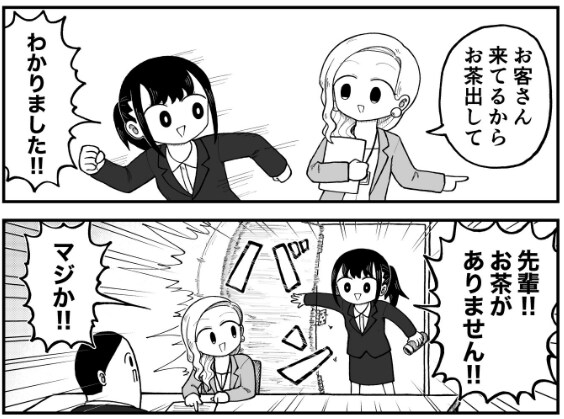 新卒ちゃんははりきってお茶を用意しようとしますが、あいにくお茶を切らしている様子。急いで「先輩お茶がありません!」と先輩に伝えに行くと…。