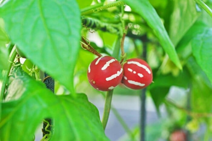白いスジが入った小さな実は、まるで小型のスイカのよう。実はグリーンからレッドに変化し、ポップな見た目がとてもオシャレです。実は食用ではないので食べられません。あくまで観賞用として楽しみましょう。※参考価格:300~500円前後(3号ポット苗)