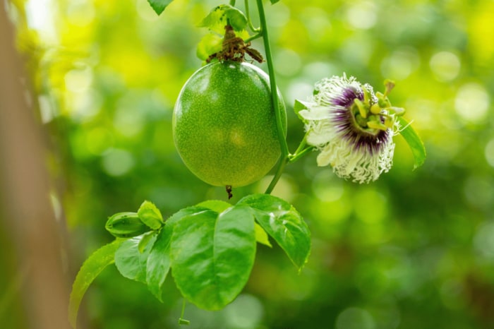 パッションフルーツはユニークな花と果実が楽しめる多年草。まるで時計のような花を咲かせることから「クダモノトケイ」とも呼ばれます。