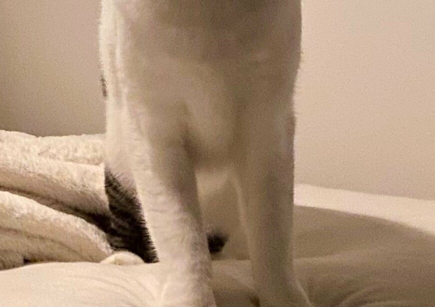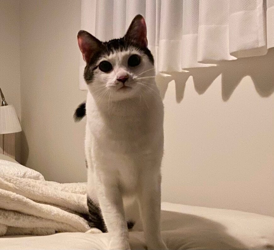 この日のセロイくんは、まだまだ遊びたいモードだったようです。ベッドの上で真剣な表情を浮かべて佇み、飼い主さんに何かを訴えている様子。黒く写った瞳を真ん丸に見開き「遊ぼうよ~」といいたげな表情を浮かべています。