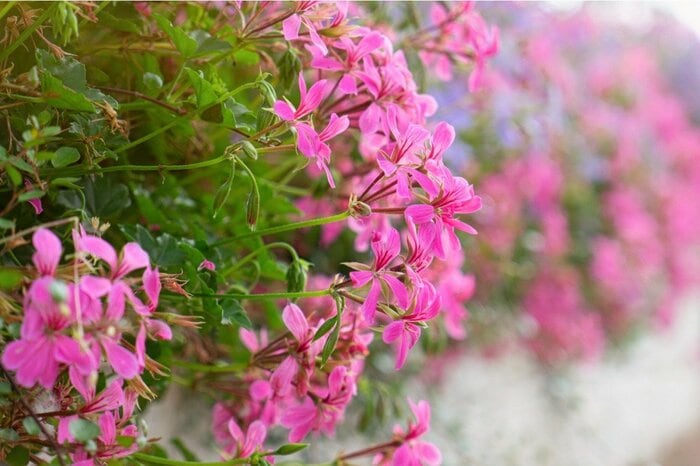 アイビーゼラニウムはゼラニウムの一種。ツル性植物のように茎を伸ばして生長することから、アイビーゼラニウムと呼ばれています。