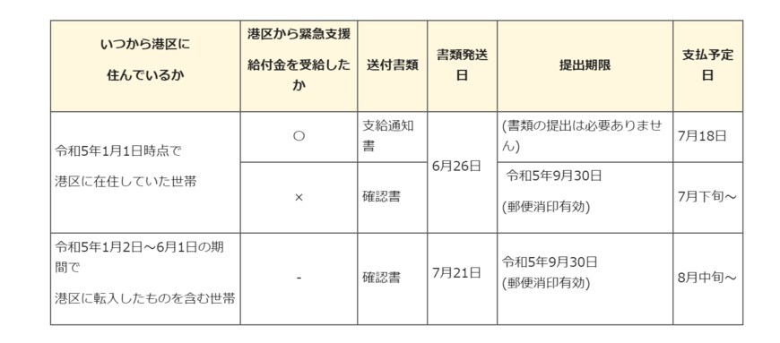 - 住民税非課税世帯で令和5年1月2日~6月1日の期間で港区に転入したものを含む世帯:確認書で手続き。発送日7月21日・令和5年9月30日(郵便消印有効)