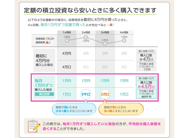 ただ、毎月一定額を買い付ける積立投資は、価格が安い時に口数を多く購入することができます。