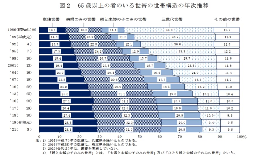 同資料によると、2021年の65歳以上世帯における単独世帯は「28.8%」。65歳以上の方がいる世帯の約3割が「おひとりさま」ということが見てとれます。また1986年の13.1%から「おひとりさま」が2倍以上に増えていることもわかりました。