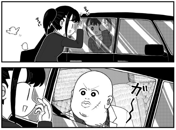 前髪チェック中に車の窓が開き、そこにいたのは屈強で強面のお兄さん。眉間にシワを寄せ睨みをきかすお兄さんと新卒ちゃんの間にしばしの沈黙が流れます…。