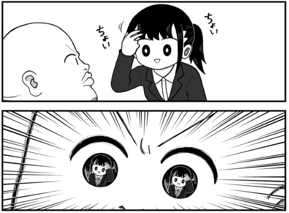 するとあろうことか、新卒ちゃんは強面なお兄さんの瞳を利用して前髪チェックを始めてしまいます。確かによく見ると強面ながらつぶらな瞳…。新卒ちゃんの強靱なメンタルを見習いたいところですが、同じ状況になったら逃げ出してしまいそうですね。