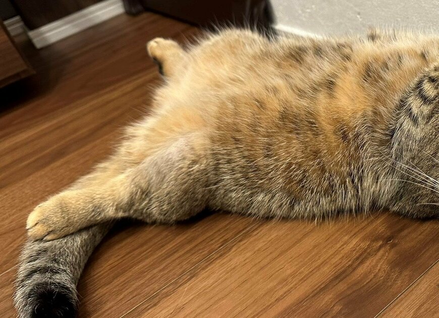 大胆に広げた脚の間から見える、モフモフしたお腹も目を惹くポイントですね。