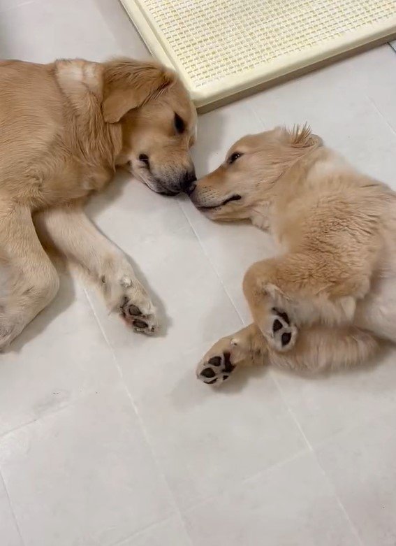 「料理中に犬の居場所を確認したら…向かい合って寝ているゴールデンレトリバー親子に癒された」というコメントとともに投稿されたのは1本の動画でした。
