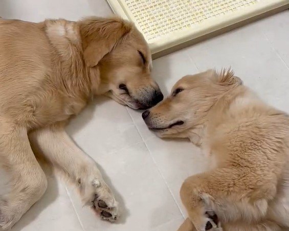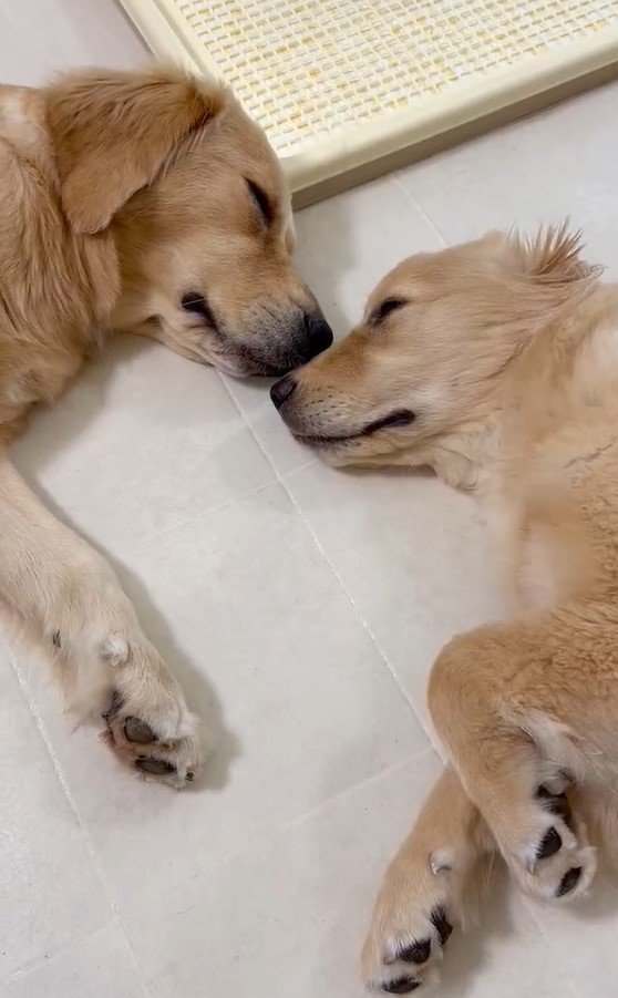料理中に犬の居場所を確認したら…向かい合って寝ているゴールデンレトリバー親子に癒された♡ pic.twitter.com/uEp2s8SxqZ