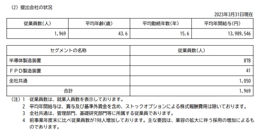 東京エレクトロン(提出会社)の2023年3月31日現在での従業員数、平均年齢、平均勤続年数および平均年間給与は以下の通りです。