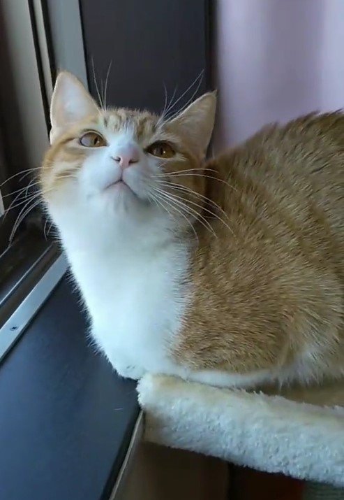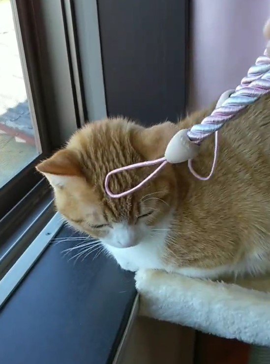動画に写るプリンちゃんは、窓辺のキャットタワーで、おててを隠す格好で座っています。そして飼い主さんが、プリンちゃんのお気に入りのグッズを持って遊びに誘うと……?