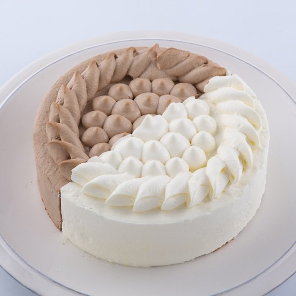 ホイップクリームとチョコクリームのケーキが半々になっている、一度の購入で2つの味の楽しめるケーキです。