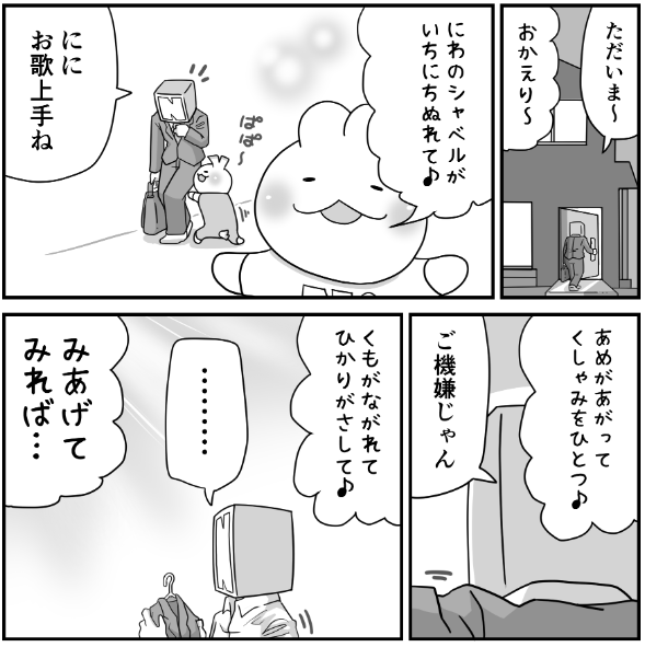 自宅につくなり、我が子のににちゃん・ととちゃんが覚えたての歌を披露してくれました。最初はスーツを脱ぎながら聞く「@nonnyakonyako」さんでしたが、次第に子どもの歌に引き込まれていきます。