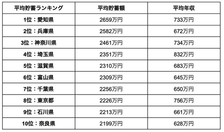 平均貯蓄額TOP3に入る「愛知県」「兵庫県」「神奈川県」は、平均収入においてもランキング内に入っており、収入から貯蓄を堅実にしている人が多いことがうかがえます。