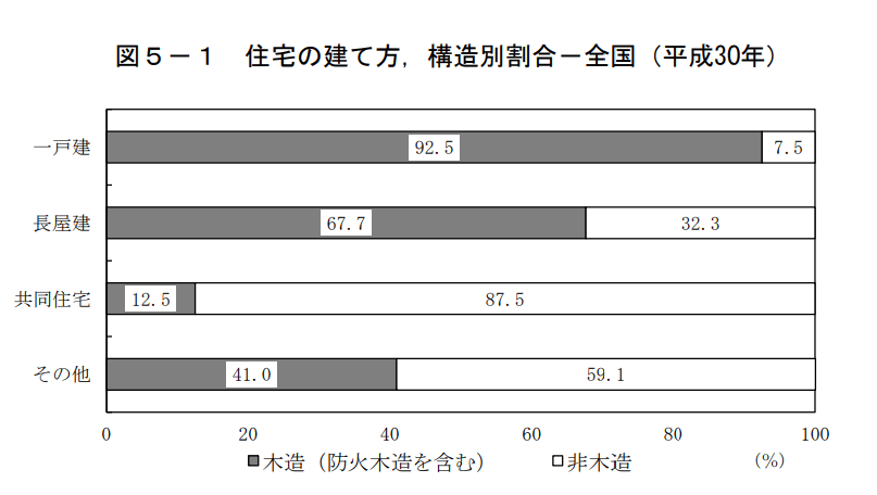 古来より我が国の建築物に採用されてきた構造形式であり、現在でも住宅の代表的な構造となっていて、2018年の総務省の統計データによると国内の一戸建て住宅の9割以上を木造住宅が占めています。(防火木造含む)