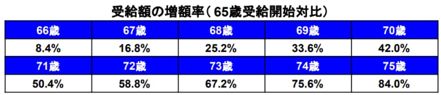 受給開始時期を遅らせることによる年金増額率は以下のとおりとなります。