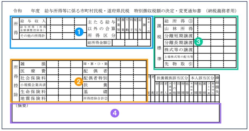 ここでは、会社員が受け取る「給与所得等に係る特別徴収税額の決定・変更通知書」を例にして住民税決定通知書の見方を解説します。