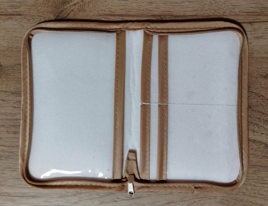 手帳型の「通帳ケース」です。開くと写真のように4つのポケットがあらわれます。通帳やカード類を便利に収納することができます。