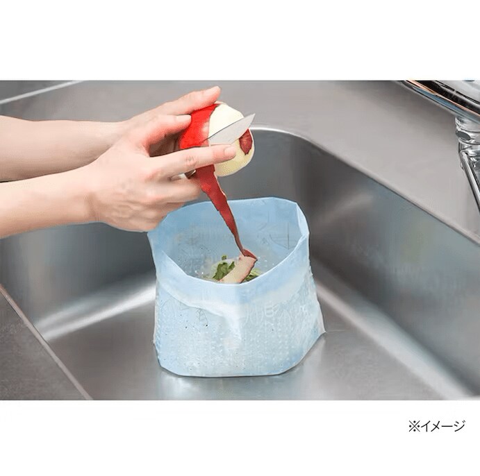 袋を広げてそのままシンク内に置くだけで使える、自立型の水切りです。三角コーナーがいらず、生ゴミがたまったらそのままさっと捨てられるので、掃除の手間も省けて衛生的です。全面に入った北欧風のかわいらしい柄が、キッチンシンクを華やかにしてくれるのもいいですね。