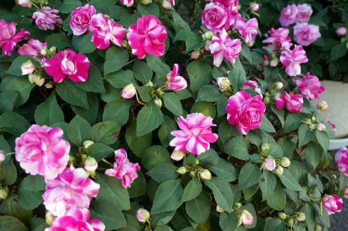 インパチェンスは耐陰性があるのでシェードガーデンにもオススメ。一重咲きのほか、ミニバラのような気品のある八重咲きも人気です。