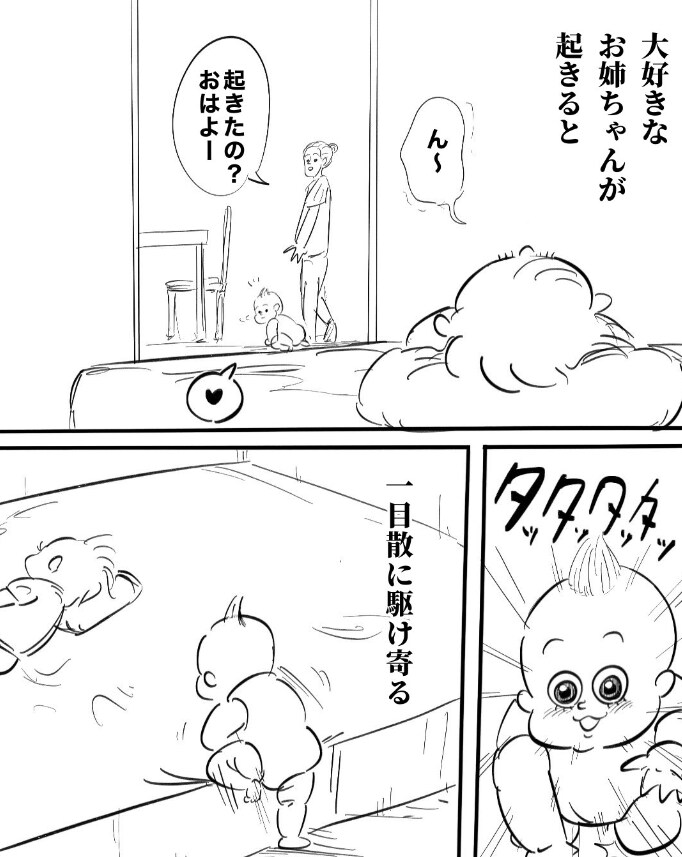 「お姉ちゃんが大好きな0歳児の可愛い行動」というコメントとともに投稿されたのは、姉弟のやり取りを綴った漫画でした。