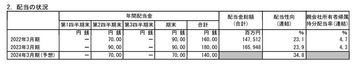 日本製鉄の株式を1年前に買い、持ち続けたとすると、「2023年3月期の中間配当」と「2023年3月期の期末配当」の計2回を受け取ることができます。