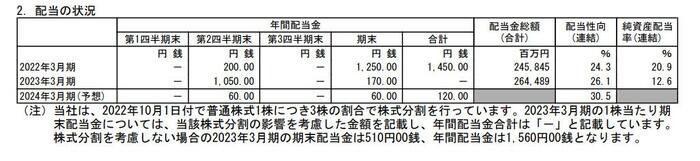日本郵船の株式を1年前に買い、持ち続けたとすると、「2023年3月期の中間配当」と「2023年3月期の期末配当」の計2回を受け取ることができます。