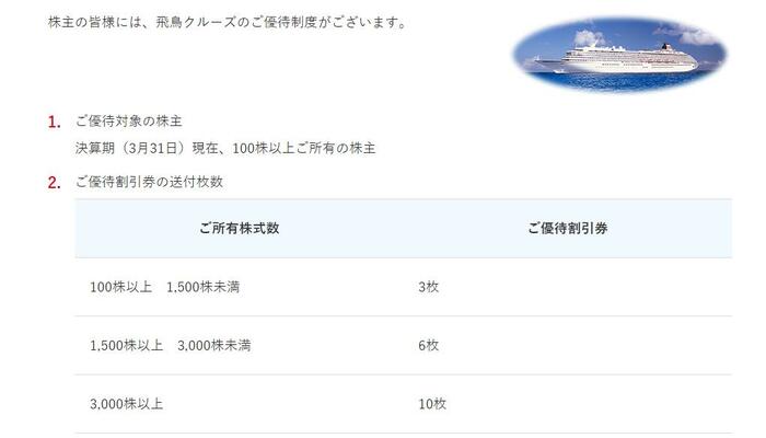 株数に応じて、「決算期後の7月1日より翌年9月30日までのクルーズ」で「優待割引券1枚につき1クルーズ1名様10%の割引」が利用できます。