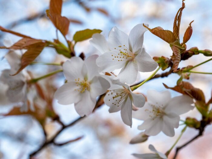 花が咲き終わった頃に若葉が出るソメイヨシノとは違い、ヤマザクラは葉と花が同時に開くのが大きな特徴。若葉は赤紫色・黄緑・褐色など色とりどり。花が散ったあとはほかのサクラと同様に緑になります。