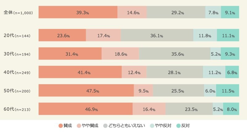 近年、外国人観光客が増加していることや、ファッションとしてのタトゥーが広まるなかで、銭湯や温泉などにおける「タトゥーがある人お断り」が議論の対象となることがあります。こうした現状を背景に、この調査では「タトゥーがある人の入店を禁止している銭湯について、賛成か反対か」についてもたずねており、その結果が示されています。