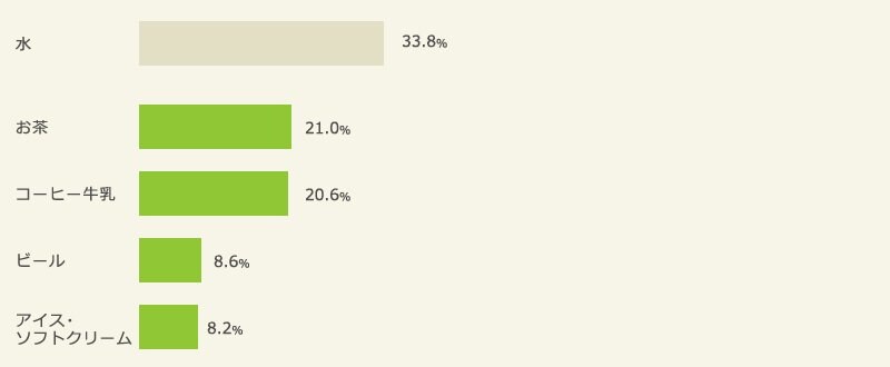 すると、給水器等で無料提供されることも多い「水」を除けば、1位は「お茶」で21.0%、僅差の2位が「コーヒー牛乳」20.6%、3位は「ビール」8.6%という結果になりました。ちなみに「牛乳」は5.6%にとどまったということで、コーヒー牛乳派が牛乳派よりも多いこともわかりました。