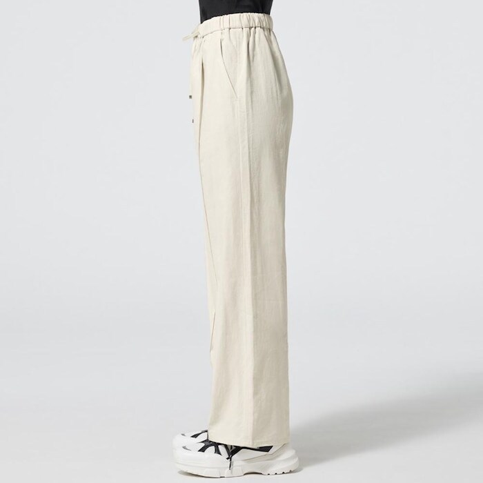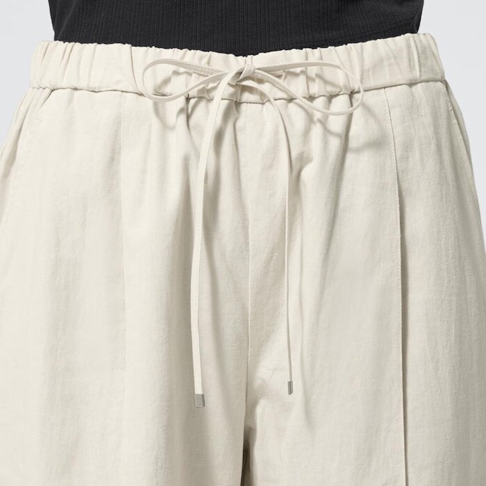 GUの「リネンブレンドプルオンパンツ」は、使いやすい工夫が満載のアイテムとなっています。ウエストはゴムと紐のプルオンタイプ仕様となっているので、お腹周りを締め付けません。