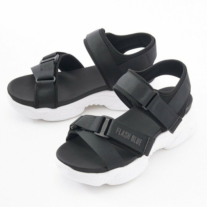 「FLASHBLUE」のサンダルが登場しました。ホワイト・ブラックの2カラーなので、シンプルでどのようなファッションにも合わせやすいデザインになっています。5.5cmのヒールがあります。覆っている面も少ないので涼しげな印象もありそうですね。