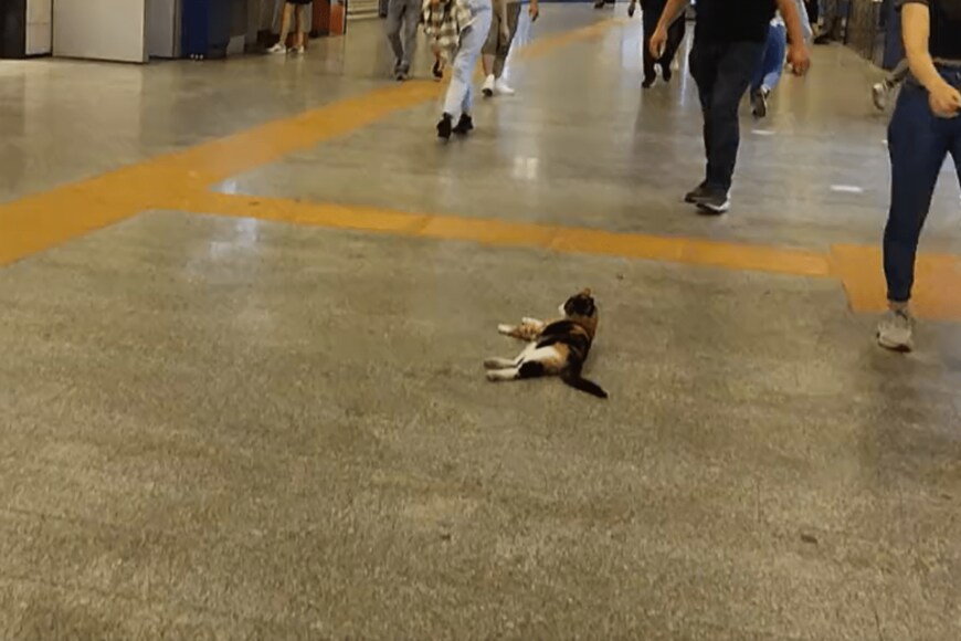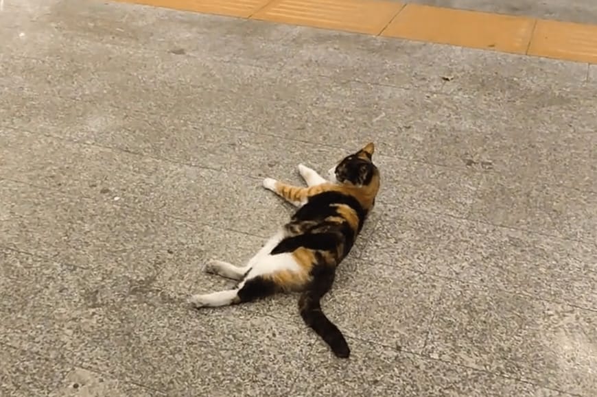 「イスタンブールにも夏が到来。暑い日は駅構内の床がヒンヤリして気持ちよさそう。通路の真ん中でリラックスする猫から、この街の人と猫の序列を感じてください」というコメントとともに投稿されたのは、約30秒の動画でした。
