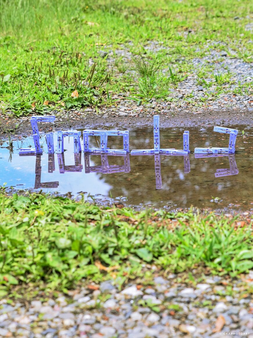 写真をパッと見ると「シンメトリーの漢字なら、なんでもできちゃうのかな?」と思いますが、そう簡単にはいかないのが「洗濯バサミフォト」。この写真は、水たまりの大きさや深さがキーポイントなのだそうです。