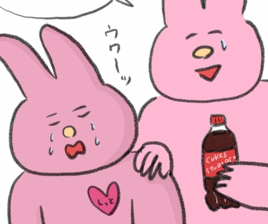 嫉妬心に駆られて涙を流している様子のウサギ。そんなウサギの肩に手を置き、もう一匹のウサギが励まそうとしています。