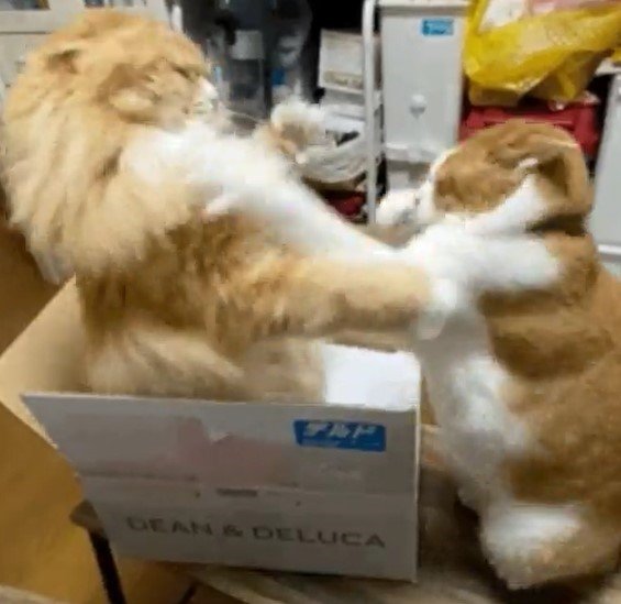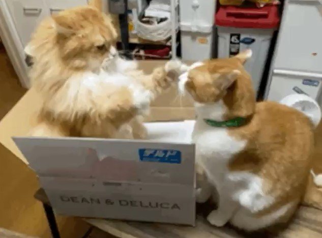 そこに写っていたのは、DEAN&DELUCAの箱を巡ってバトルを繰り広げる2匹の猫ちゃんたち。