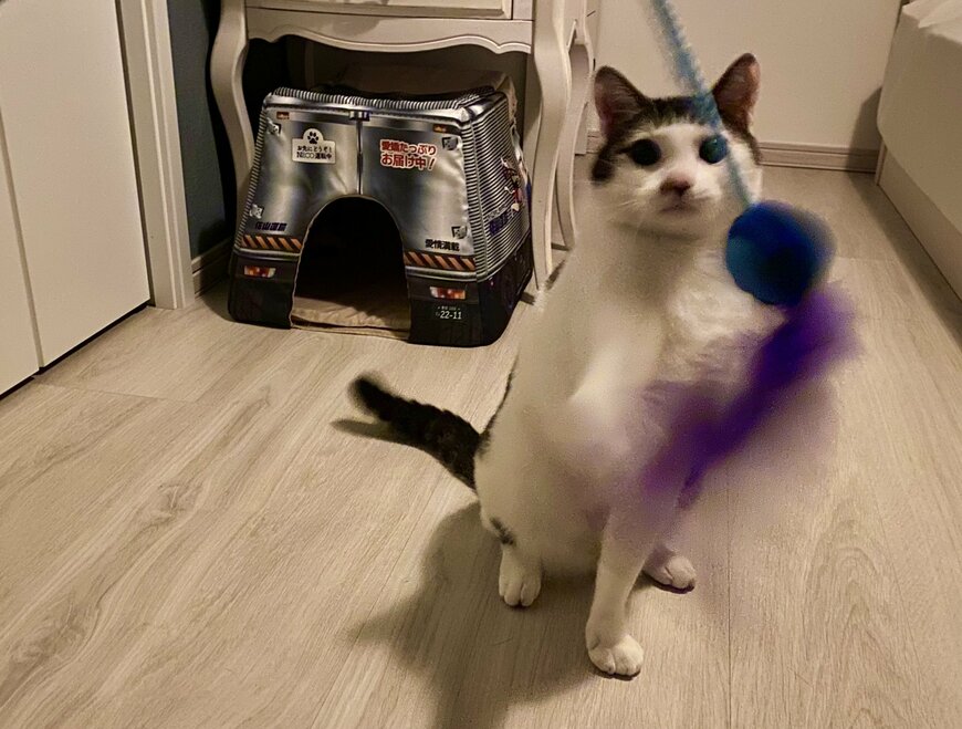 セロイくんが持ってきたのは、隠していたはずの「禁断の猫じゃらし」だったようです。まだまだ寝たくない、遊びたい!!という気持ちで運んできたのでしょうか、可愛い行動に笑みがこぼれてしまいますね。